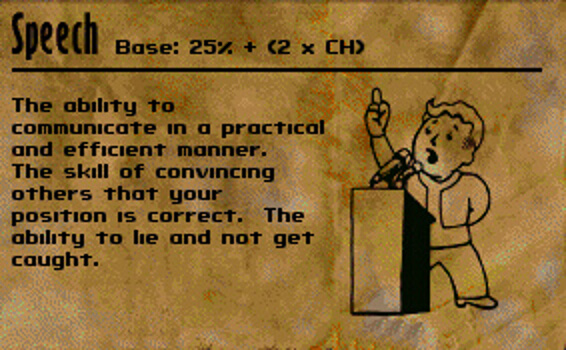 Игра через болтливого оратора существенно меняла привычный игровой опыт. В большей степени в моих интересах было со всеми разговаривать, и в меньшей - копить деньги на какое-то оружие, без которого на обычном билде никуда. Конечно, я всё же приобрёл себе самострел. Если кто не помнит, это такая кривая плевалка с патронами 9мм, куда можно засунуть один патрон за раз. Насколько я помню, даже у нормального стрелка эта штука мажет. В моих же руках, с ужасно прокаченным лёгким оружием и особенностью "порченный", шансов попасть не было никаких. В чём я быстро убедился, когда решил выполнить квест на растопку печи в доме самогонщика. Там ведь кругом бродят гекко, отличная возможность проверить пуху. Что ж, 32% шанс попадания в упор. И, конечно же, не последовало не только попадания, но мой дистрофик ещё и валыну на землю уронил. К счастью, с навыком скрытности (который я додумался взять на старте) удалось выполнить квест без боёв.