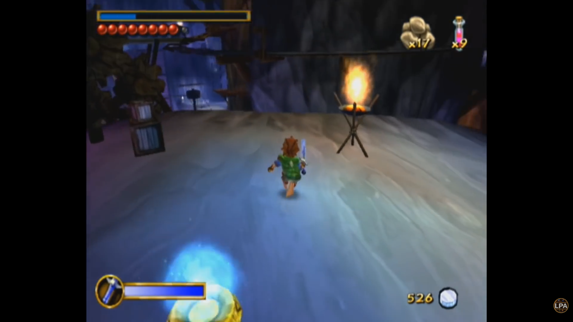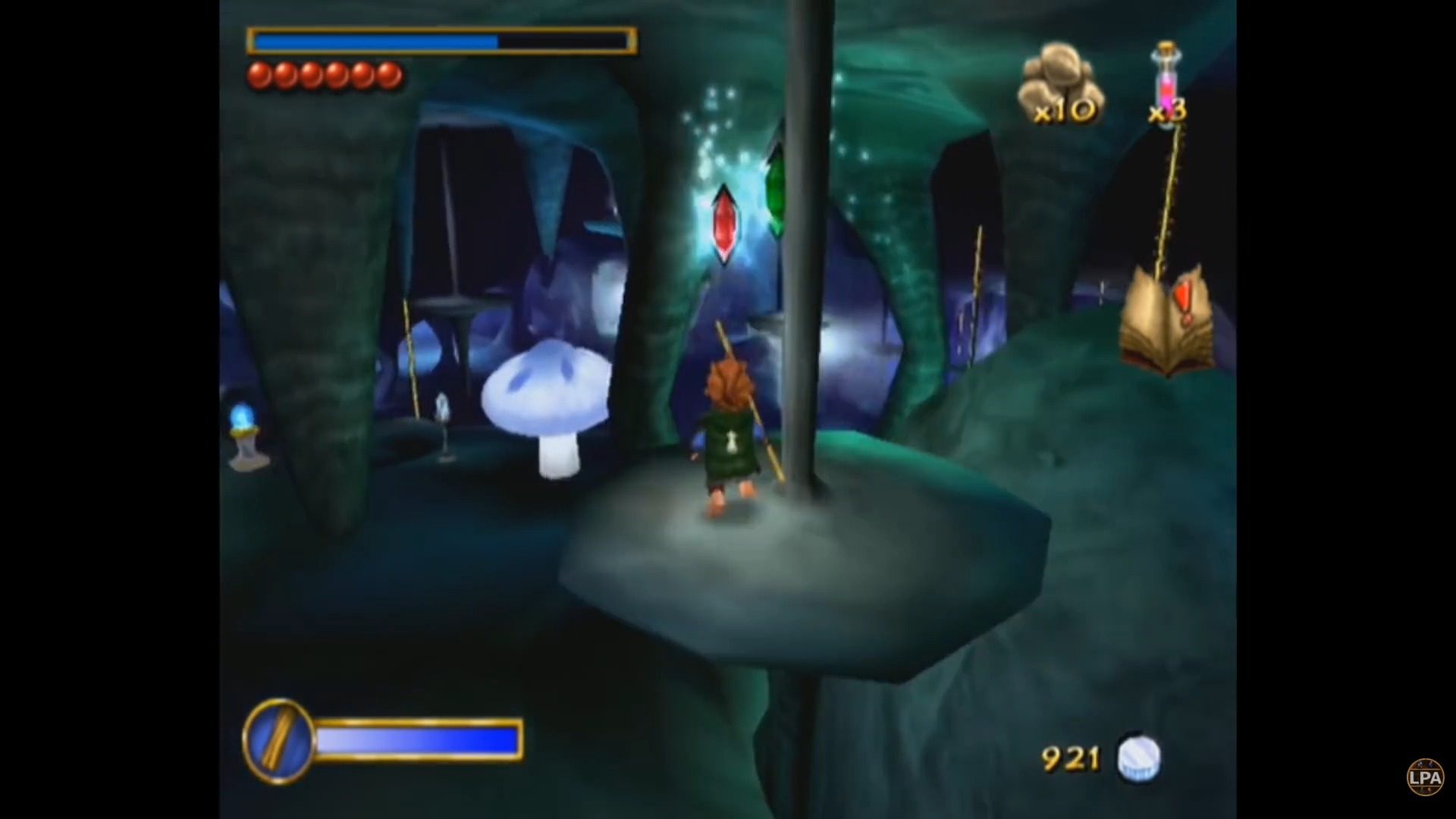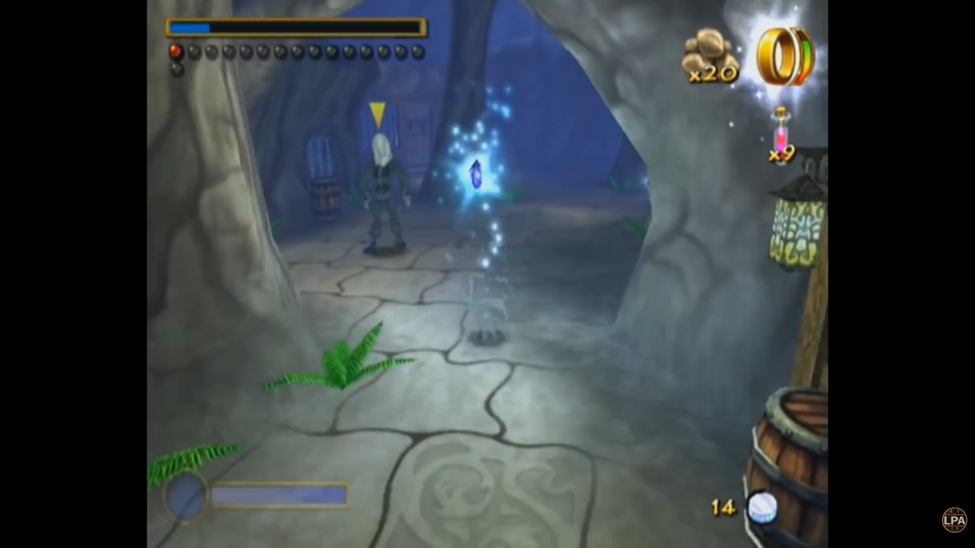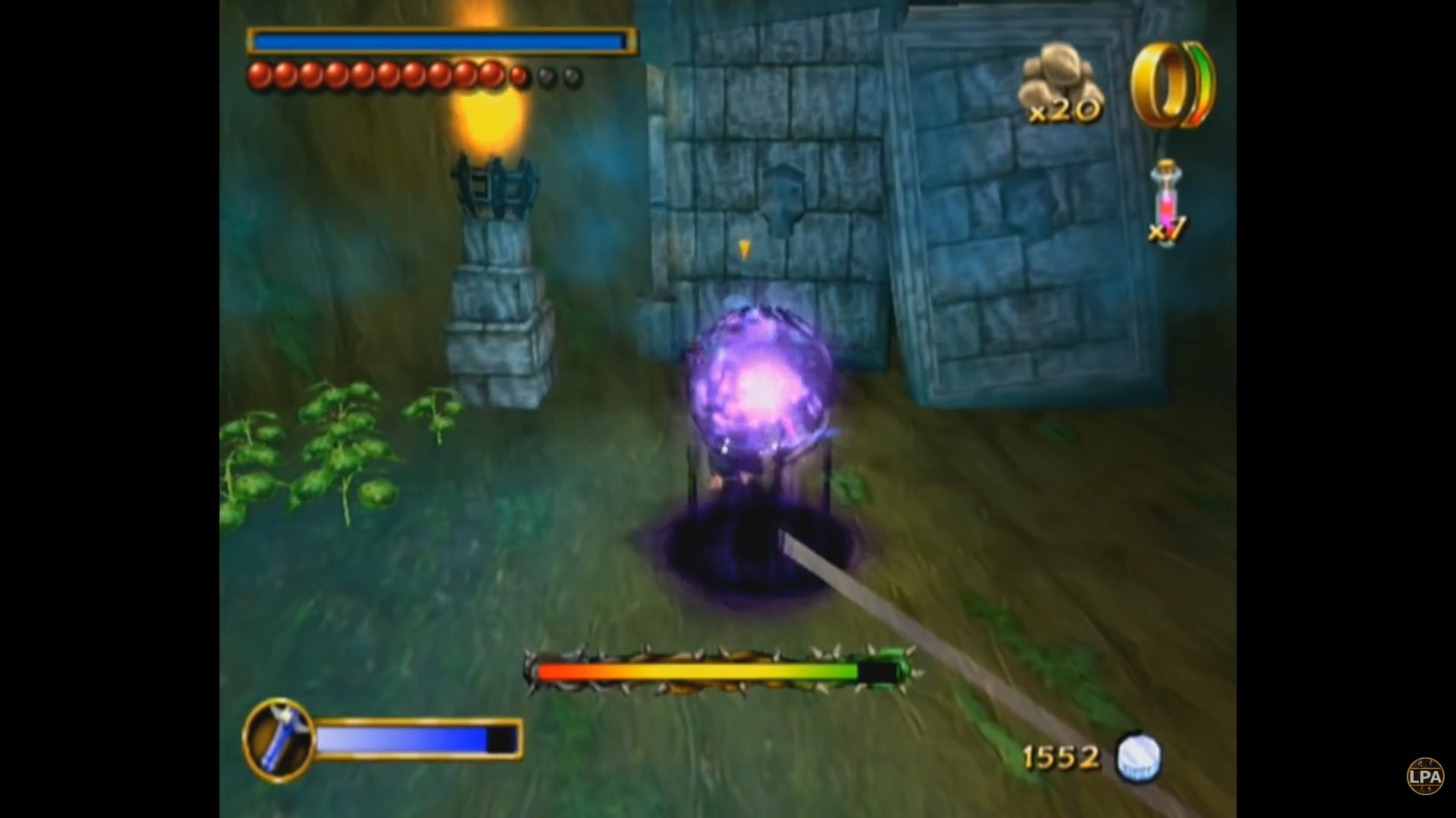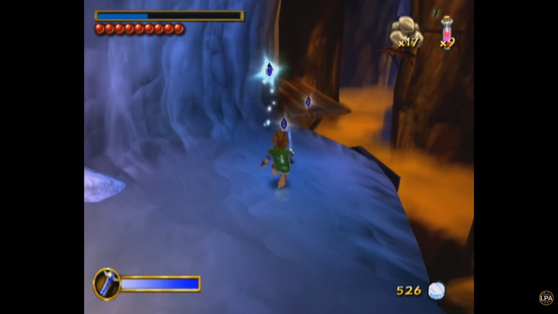 Кристаллы, о которых я упоминал - это не аналог рупий из Зельды. Это так называемые "очки храбрости". Набрав тысячу таких очков, игрок получает прибавку к максимальному здоровью. Стартовав с трех пузырьков (читай - сердечек) здоровья, к концу игры я набрал тридцать. Если бежать чисто по сюжету, скорее всего их будет около пятнадцати - помимо раскидывания по уровням, кристаллы щедро отсыпают за убийство врагов и выполнение квестов. Также маленькие фиолетовые кристаллы работают как "хлебные крошки", указывая путь к следующей сюжетной цели.